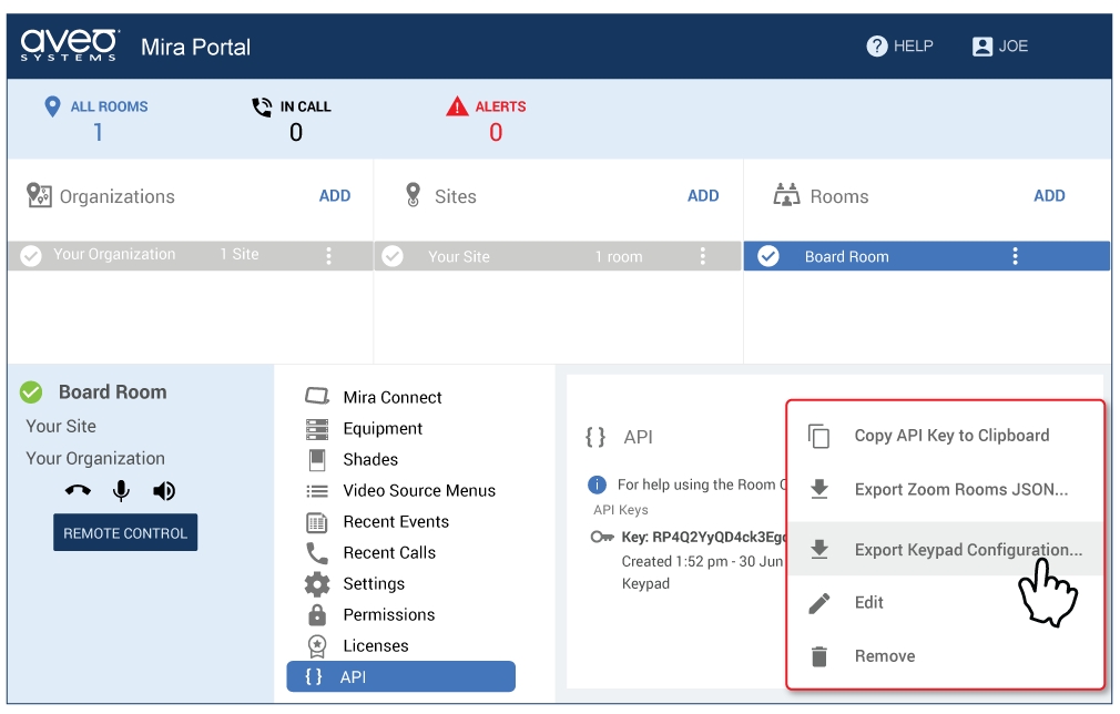 Get the API key from the room's API menu in Mira Portal, as described in the Create a Mira Connect API Key section.